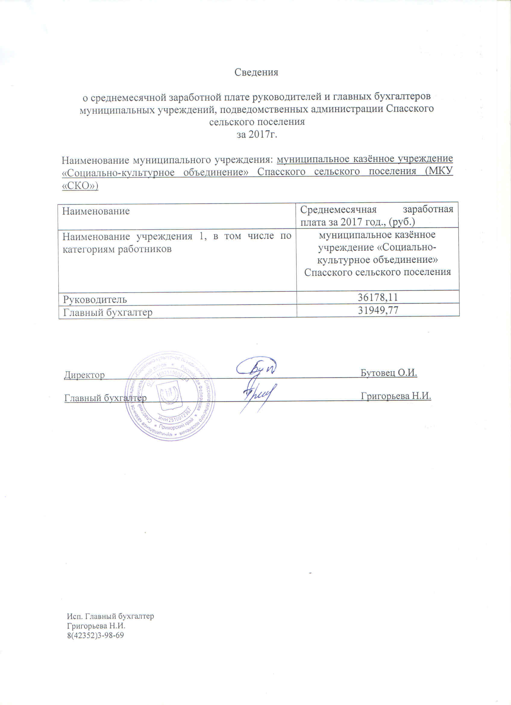 Сведения о среднемесячной заработной плате руководителей и главных бухгалтеров муниципальных учреждений, подведомственных администрации Спасского сельского поселения за 2017 год. (скачать)