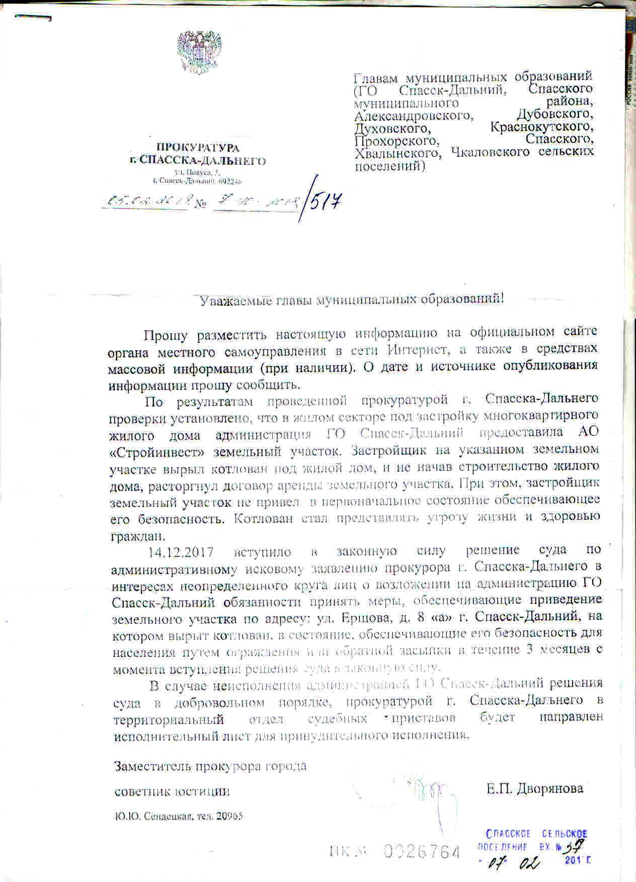 Письмо заместителя прокурора города, советника юстиции Е.П. Дворяновой от 05 февраля 2018г. № 7-40-2018/517 (скачать)