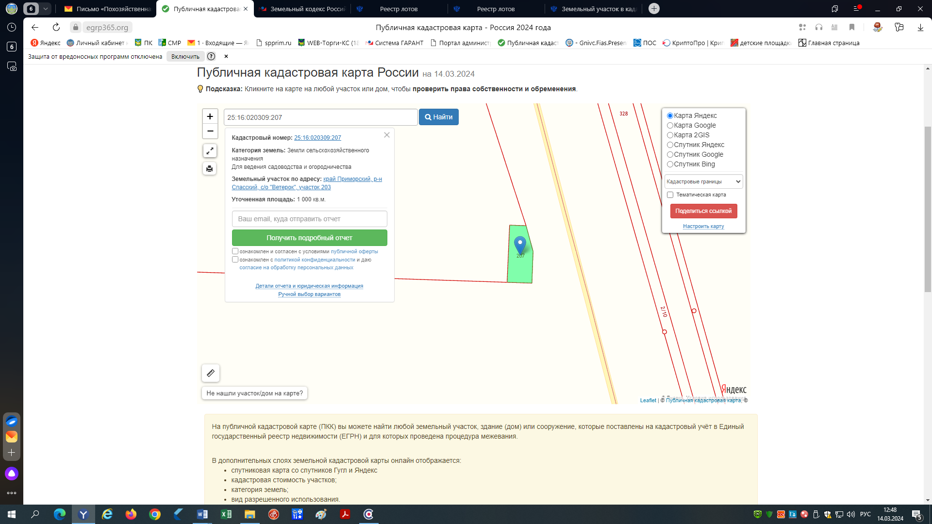 1) Земельный участок с кадастровым номером 25:16:020309:207, площадью 1000 кв. метров. Местоположение установлено относительно ориентира, расположенного в границах участка. Почтовый адрес ориентира: Приморский край, Спасский муниципальный район, с/о Ветерок, участок 203. Категория земель: земли сельскохозяйственного назначения. Вид разрешенного использования: для ведения садоводства и огородничества.
